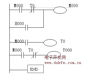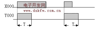 首先介紹一個常用的點動計時器,其功能為每次輸入X000時,接通時,Y000輸出一個脈寬為定長的脈沖,脈寬由定時器T000設(shè)定值設(shè)定。它的時序圖如下圖所示: