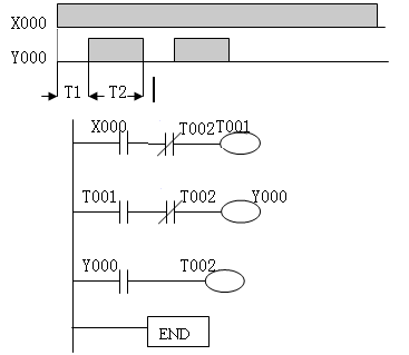 運用定時器還可構(gòu)成振蕩電路,如根據(jù)下面的時序圖,我們可用兩個定時器T001、T002構(gòu)成振蕩電路,其梯形圖如下: