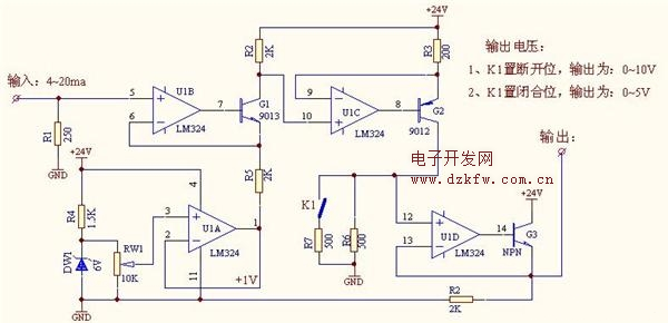 該電路輸入信號為:4~20mA,其輸出受K1開關控制: