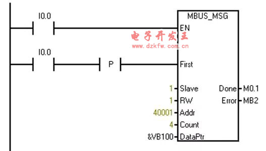 Dataptr:讀寫數據存放的地址,使用指針的方式表示,實際地址以十六位的方式表示,假設使用的地址是&VB100。前面的指令管腳定義的是對變頻器運行命令的控制,則當把16#1001寫入到VW100中,則電機正轉運行,若把16#1003寫入到VW100中,則表示的是反轉運行。若是讀取的功能,假設MBUS_MSG指令中adder為413077,count為2,Dataptr為&VB102, 則表示把413077這個地址中的數據讀取出來存放于VW102,把413078的數據讀取出來存放于VW104中。