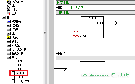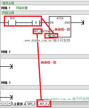 注意,觸發中斷指令的外部條件,需要與事件號(EVNT)條件相一致;INT數與中斷程序名稱相一致。比如“I0.0+下降沿”,好比一把鑰匙,而EVNT中的1好比是1號房間,那只有當1號房間的鑰匙,插入1號房間的鎖里,才能打開1號房間。打開之后做什么?通過指令連接INT_0中斷程序里面的內容。