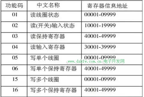 功能碼指定了對從站設備讀操作還是寫操作,同時也指定了MODBUS寄存器地址的類型,常用功能碼有: