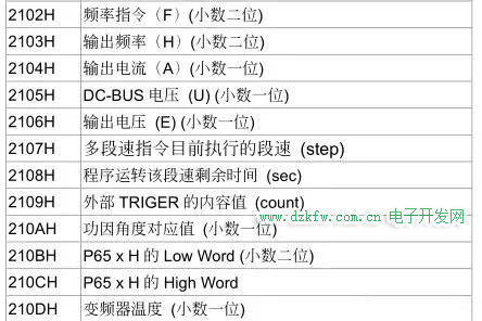 輸出電壓地址2106H 變頻器溫度地址 210DH