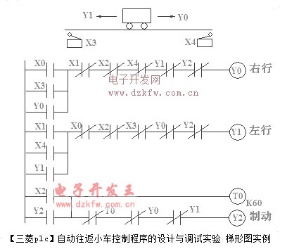 1.自動往返小車順序控制程序?qū)嶒?BR>自動往返小車的工作過程及程序梯形圖如圖1所示。