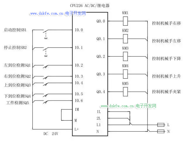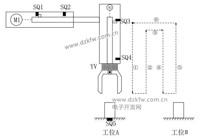 如上圖所示,M1為控制機(jī)械手左右移動(dòng)的電動(dòng)機(jī),M2為控制機(jī)械手上下升降的電動(dòng)機(jī),YV線圈用來(lái)控制機(jī)械手夾緊防松,SQ1為左到位檢測(cè)開(kāi)關(guān),SQ2為右到位檢測(cè)開(kāi)關(guān),SQ3為上到位檢測(cè)開(kāi)關(guān),SQ4為下到位檢測(cè)開(kāi)關(guān) ,SQ5為工件檢測(cè)開(kāi)關(guān)。