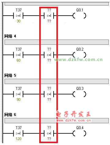先設定一個I0.1的啟動+自鎖條件,確保第二個定時器T38滿足啟動條件。然后根據推算選好設定值,再按照逆序熄滅的要求,把此前預留得比較指令的位置,設定好時間值。