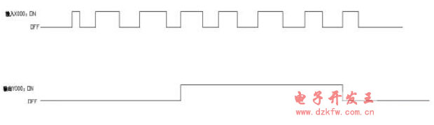 輸入按鈕X000按下4次,信號燈Y000亮;輸入按鈕X000再按下3次,信號燈Y000熄滅。按鈕計數控制時序圖如下: