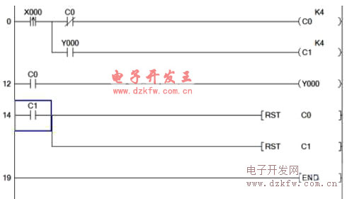 (3)繼續按下按鈕X000,計數器C0不計數,C1開始計數,當C1的當前值達到4時,計數器CO和C1都被復位,Y000斷開,信號指示燈滅。