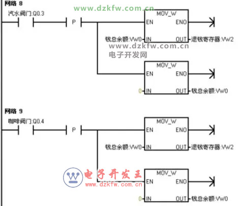 找錢,這里將錢總余額VW0 里面的數據賦給退錢寄存器VW2,并將余額清零。