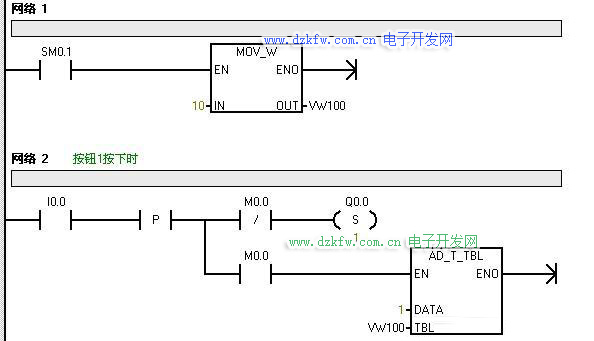 程序解析:網絡1為填表指令設置:即VW100為表地址,容許填表數據數=10,即容許最多填寫10組數據,即容許間隔小于10秒連續按不同按鈕10下,使之對應用的燈泡按按鈕的順序依次各亮10秒,這樣就有重復使用同一個燈泡的可能。如連續按按鈕:1、3、2、4、2、3,則輸出為Q0.0、Q0.2、Q0.1、Q0.3、Q0.1、Q0.2各燈泡依次個亮10秒。