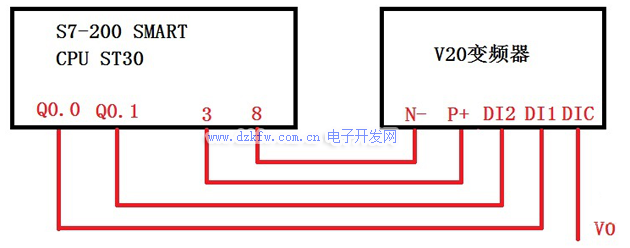 西門子PLC控制變頻器時經常碰到需要頻繁修改頻率,只能選擇用PLC通信來給定頻率,在通過數字輸出Q點來控制變頻器啟停正反轉,從而實現PLC自動控制。在此我們以CPU ST30和V20變頻器為例來講解。硬件連接如下圖所示: