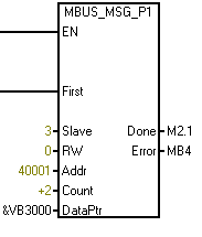 MBUS_SLAVE 指令被用于為Modbus主設備發出的請求服務,并且必須在每次掃描時執行,以便允許該指令檢查和回答Modbus請求。在每次掃描且EN輸入開啟時執行該指令。MBUS_SLAVE指令無輸入參數。當MBUS_SLAVE指令對Modbus請求作出應答時, " 完成"輸出打開。如果沒有需要服務的請求時, "完成"輸出關閉。"錯誤"輸出包含執行該指令的結果。該輸出只有在"完成"打開時才有效。如果"完成"關閉,錯誤參數不會改變。
