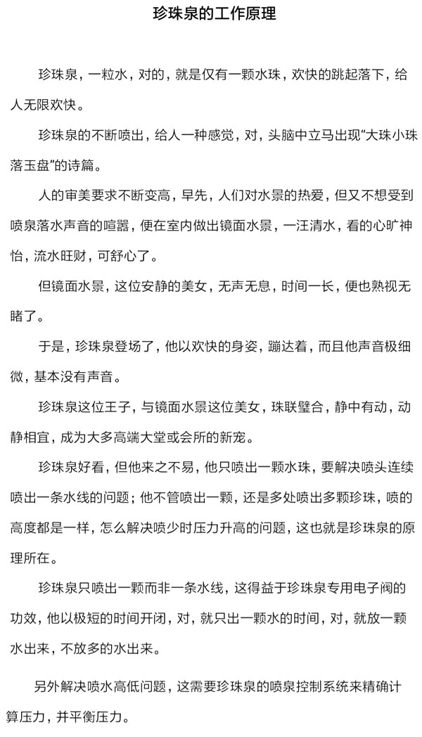 3、水珍珠噴泉 、 利用特殊音波將水變成球體的噴水裝置和全頻高速閃光燈的視覺殘像效果組成的產(chǎn)品:水珍珠可在 1 秒鐘內(nèi)連續(xù)噴出 50-60 顆大小的水珠,用專用全頻高速閃光燈 實現(xiàn)水珠懸浮在空中的動人景象。這種全頻高速閃光燈和普通閃光燈不同,它可高速閃光,看起來與自然的室內(nèi)照明無兩樣。水珍珠與普通噴水不同,它不僅僅是單一 的空間裝飾,而且可在噴泉設(shè)施中利用水的視覺、觸覺效果,為人們提供藝術(shù)性和觀賞性。水珠大小、噴水形狀可據(jù)不同用途安裝在不同的地方。