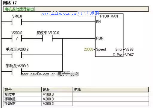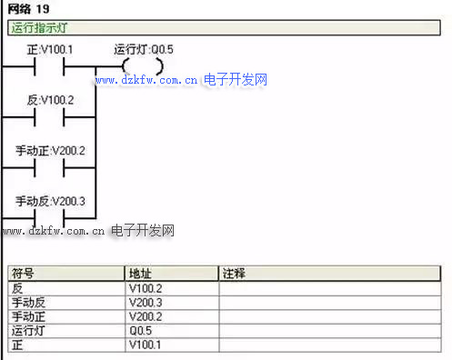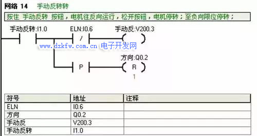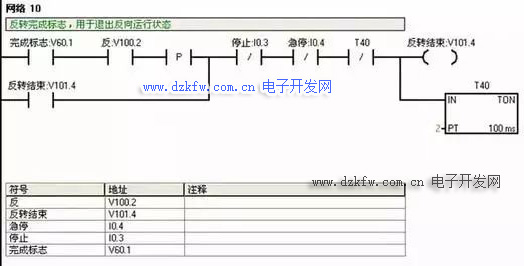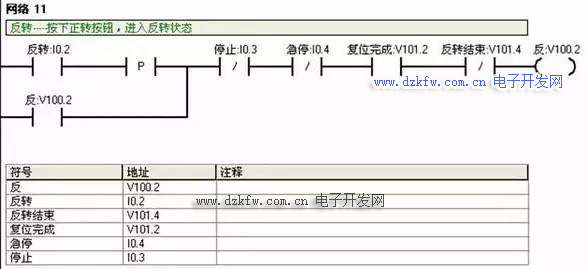 I0.2:反轉按鈕;V100.2:反轉運行狀態;V101.2:復位完成標志。正反轉自動運行前必須復位完成;