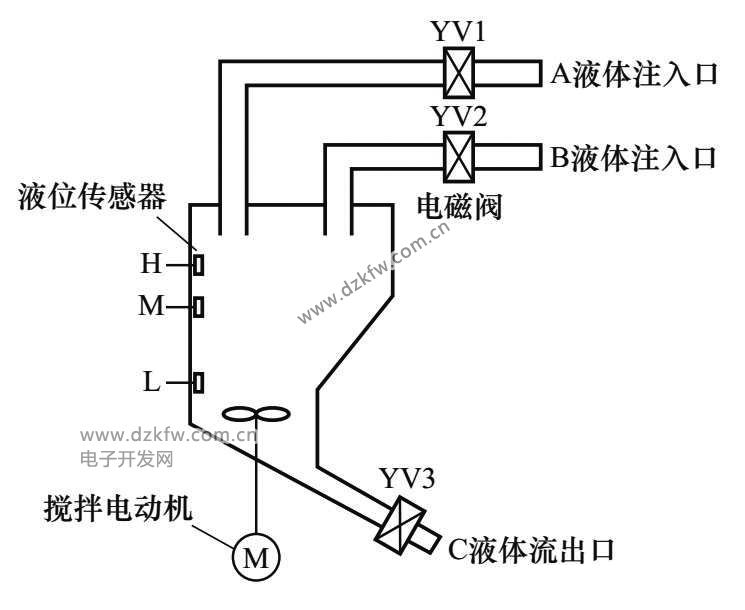 兩種液體混合裝置如圖5-5所示,YV1、YV2分別為A、B液體注入控制電磁閥,電磁閥線圈通電時打開,液體可以流入,YV3為C液體流出控制電磁閥,H、M、L分別為高、中、低液位傳感器,M為攪拌電動機,通過驅(qū)動攪拌部件旋轉(zhuǎn)使A、B液體充分混合均勻。