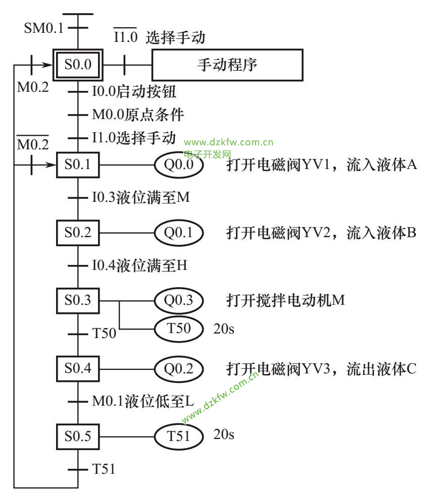 ③啟動自動控制:按下啟動按鈕SB1→[6]I0.0常開觸點閉合→執(zhí)行“SCRT S0.1”指令,程序轉(zhuǎn)移至S0.1程序段→由于[10]SM0.0觸點在S0.1程序段運行期間始終閉合,Q0.0線圈得電→Q0.0端子內(nèi)硬觸點閉合→KM1線圈得電→主電路中KM1主觸點閉合(圖5-6中未畫出主電路部分)→電磁閥YV1線圈通電,閥門打開,注入A液體→當(dāng)A液體高度到達(dá)液位傳感器M位置時,傳感器開關(guān)SQ2閉合→[10]I0.3常開觸點閉合→執(zhí)行“SCRT S0.2”指令,程序轉(zhuǎn)移至S0.2程序段(同時S0.1程序段復(fù)位)→由于[13]SM0.0觸點在S0.2程序段運行期間始終閉合,Q0.1線圈得電,S0.1程序段復(fù)位使Q0.0線圈失電→Q0.0線圈失電使電磁閥YV1閥門關(guān)閉,Q0.1線圈得電使電磁閥YV2閥門打開,注入B液體→當(dāng)B液體高度到達(dá)液位傳感器H位置時,傳感器開關(guān)SQ3閉合→[13]I0.4常開觸點閉合→執(zhí)行“SCRT S0.3”指令,程序轉(zhuǎn)移至S0.3程序段→[16]常ON觸點SM0.0使Q0.3線圈得電→攪拌電動機M運轉(zhuǎn),同時定時器T50開始20s計時→20s后,定時器T50動作→[16]T50常開觸點閉合→執(zhí)行“SCRT S0.4”指令,程序轉(zhuǎn)移至S0.4程序段→[19]常ON觸點SM0.0使Q0.2線圈被置位→電磁閥YV3打開,C液體流出→當(dāng)液體下降到液位傳感器L位置時,傳感器開關(guān)SQ1斷開→[3]I0.2常開觸點斷開(在液體高于L位置時SQ1處于閉合狀態(tài)),產(chǎn)生一個下降沿脈沖→下降沿脈沖觸點為繼電器M0.1線圈接通一個掃描周期→[19]M0.1常開觸點閉合→執(zhí)行“SCRT S0.5”指令,程序轉(zhuǎn)移至S0.5程序段,由于Q0.2線圈是置位得電,故程序轉(zhuǎn)移時Q0.2線圈不會失電→[22]常ON觸點SM0.0使定時器T51開始20s計時→20s后,[22]T51常開觸點閉合,Q0.2線圈復(fù)位→電磁閥YV3關(guān)閉;與此同時,S0.1線圈得電,[9] S0.1程序段激活,開始下一次自動控制。