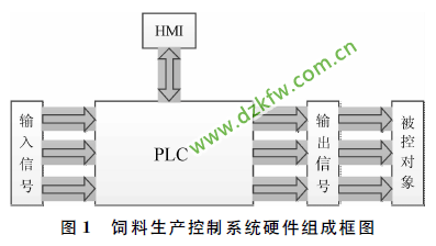在飼料生產控制系統中,主要的組成部分有:人機交互模塊HMI、PLC模塊、被控對象,如圖1所示。