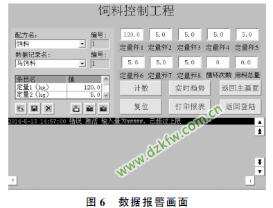 數據報警畫面主要是用來選擇加工飼料的配方和配方中數據的顯示,同時可以進行報警顯示。報警分為兩種,一種是配方中數據設定值的報警,即當設定值高于上限或低于下限時,產生報警;另一種是稱量設備稱量值的報警,即當稱量值高于配方中的設定值時,產生報警。在增強視圖中選擇報警視圖插入畫面中,在屬性框中對其進行編輯,設置定量秤的上限值和下限值。數據報警畫面如圖6所示。