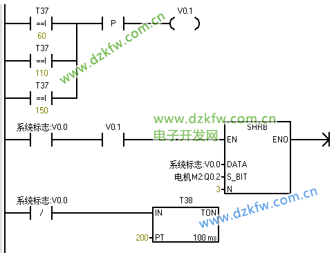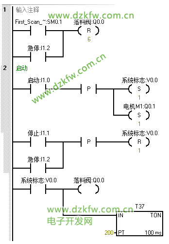 下面通過一個小案例來說明移位寄存器指令的應(yīng)用。 如下圖所示為多級傳送帶的控制示意圖,控制要求如下:(1)落料閥打開后,傳送電機M1馬上打開,延時6S后電機M2啟動(2)電機2 啟動后延時5S啟動電機M3 ;電機M3啟動后延時4S啟動電機M4(3)若按下停止按鈕,落料閥需關(guān)閉,但為了防止物料累積,需根據(jù)各級傳送帶傳送的時間差別分別將4臺電機停止。(4)落料閥關(guān)閉6S后停止電機M1,5S后停電機M2, 4S后停電機M3,3S后停電機M4(5)按下緊急按鈕,所有輸出都要停止