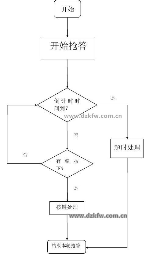 5)參賽選手在設定的時間內進行搶答,搶答有效,定時器停止工作,顯示器上顯示選手的編號和搶答的時間,并保持到主持人將系統清除為止。
