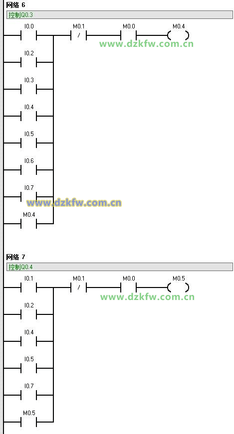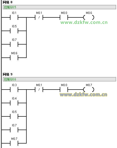 Network 9 LD M1.1 O Q0.5 AN I1.1 A M0.1 = Q0.5 Network 10 LD M1.2 O Q0.6 AN I1.1 A M0.1 = Q0.6 Network 11 LD M1.3 O Q0.7 AN I1.1 A M0.1 = Q0.7 Network 12 LD I0.1 O I0.2 O I0.6 O I0.4 O I0.5 O I0.7 O M0.5 AN M0.4 = M0.5 Network 13 LD I0.0 O I0.1 O I0.2 O I0.3 O I0.6