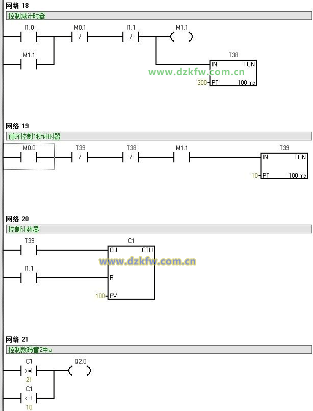 O I0.5 O I0.7 O M1.2 AN M0.4 = M1.2 Network 18 LD I0.1 O I0.2 O I0.3 O I0.4 O I0.5 O I0.7 O M1.3 AN M0.4 = M1.3 Network 19 LD I1.0 O M0.2 A M0.3 AN I1.1 = M0.2 TON T38, 31 Network 20 LD M0.1 AN T39 AN T38 A M0.2 TON T39, 1 Network 21 LD T39 LD I1.1 CTU C1, 100 Network 22 LDW>= C1, 21