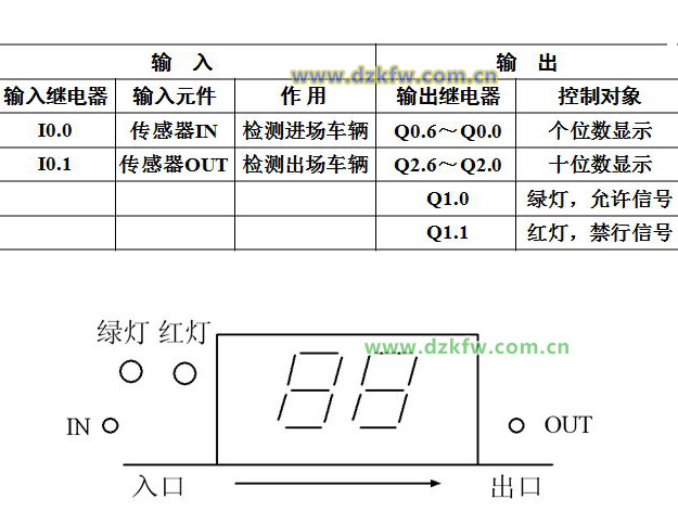 某停車場最多可停50輛車,用兩位數碼管顯示停車數量。用出入傳感器檢測進出車輛數,每進一輛車停車數量增1,每出一輛車減1。場內停車數量小于45時,入口處綠燈亮,允許入場;等于和大于45時,綠燈閃爍,提醒待進車輛司機注意將滿場;等于50時,紅燈亮,禁止車輛入場。設計控制線路和PLC程序
