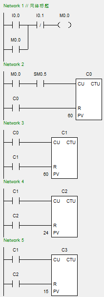 1)分析控制要求,選擇控制原則。根據(jù)前面的分析,長(zhǎng)時(shí)限的延時(shí)控制要求,因此需要用到基本位邏輯指令和定時(shí)器+計(jì)數(shù)器組合來(lái)完成。
