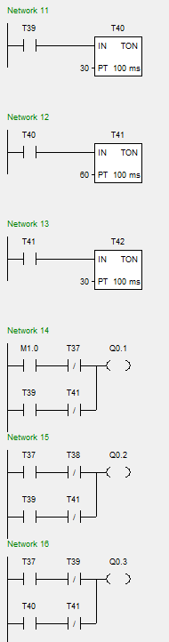 梯形圖程序中,比較觸點(diǎn)可以直接裝入,也可以串、并聯(lián)使用。在這個(gè)任務(wù)中,選用時(shí)基為100 ms的T37定時(shí)器,預(yù)置值PT=270。采用比較指令設(shè)計(jì)的梯形圖如圖6所示。