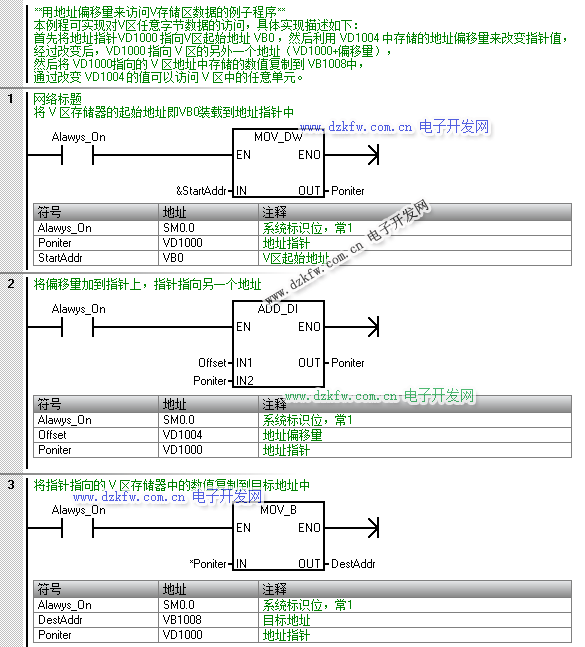 首先將地址指針VD1000 指向V區(qū)起始地址 VB0 ,然后利用 VD1004 中存儲的地址偏移量來改變指針值,