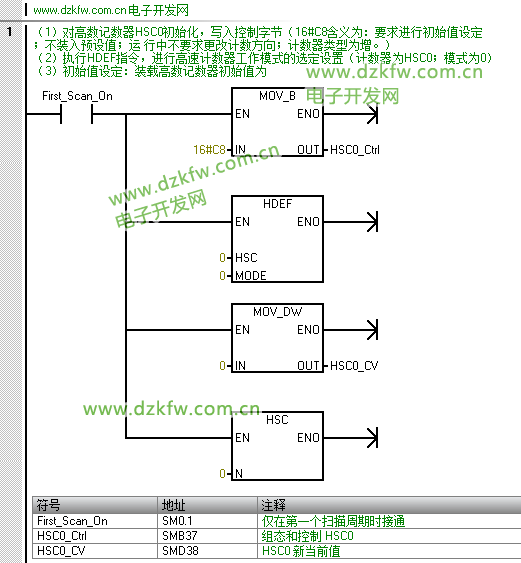 上述程序注解:(1)對高數記數器HSC0初始化,寫入控制字節(16#C8含義為:要求進行初始值設定;不裝入預設值;運 行中不要求更改計數方向;計數器類型為增。)