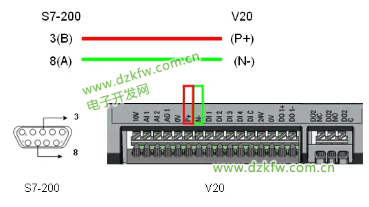 本示例根據(jù)操作手冊(cè)中的串口引腳說(shuō)明3#引腳為RS485信號(hào)正,8#引腳為RS485信號(hào)負(fù);用電纜將S7-200 SMART 自帶的串口與V20的RS485接口相連(注意端口連接規(guī)則:V20的P+對(duì)3、N-對(duì)8),如下圖所示: