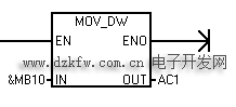 最后通過“移動雙字”(MOV_DW)指令,將被尋址的存儲地址(&MB10)移至指針位置(AC1),提個醒:程序運行時,AC1保存不是數據,而是被指向的存儲地址MB10。