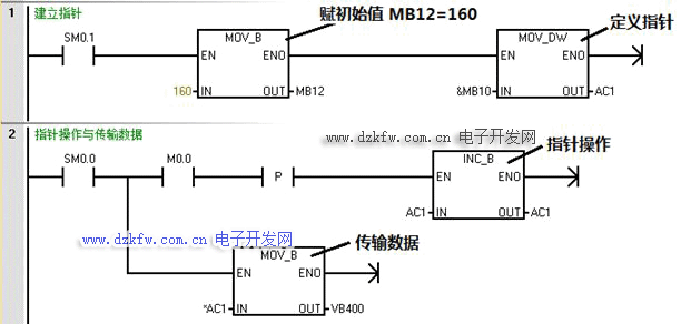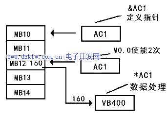 然后設定用于存儲 被尋址的存儲地址(&MB10)的存儲地址(指針),但只能使用V存儲區,L 存儲區和累加器寄存器(AC1、AC2、AC3)用作指針,例如用AC1;