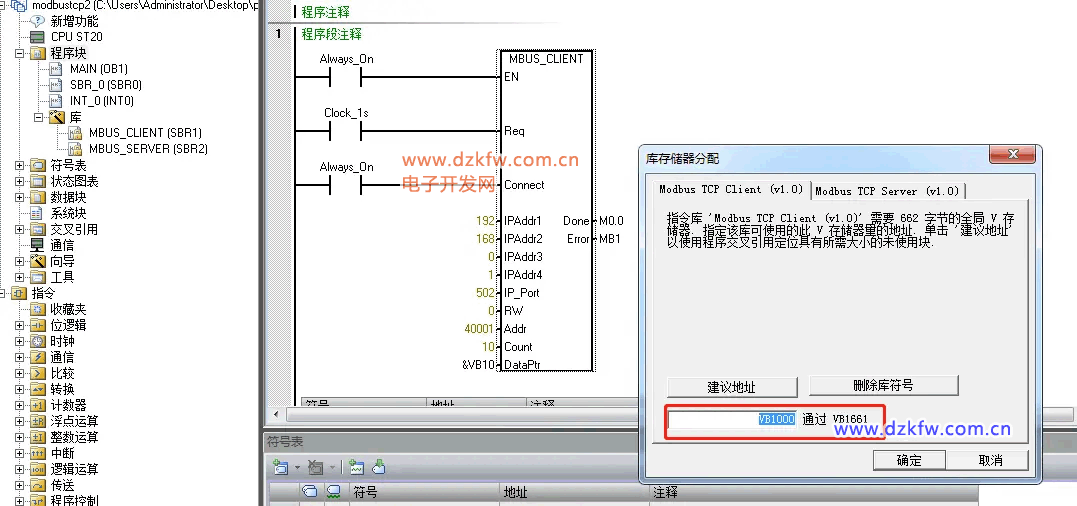提醒一下:與MODBUS RTU相比,這兒沒有了速率、校驗等問題,但是也要設置好對方的IP地址、端口(一般是502)、信息所在的地址區,以及讀回來的數據存儲位置(這是VB10開始的20個字節,因為40001的單位是兩字節的字)。