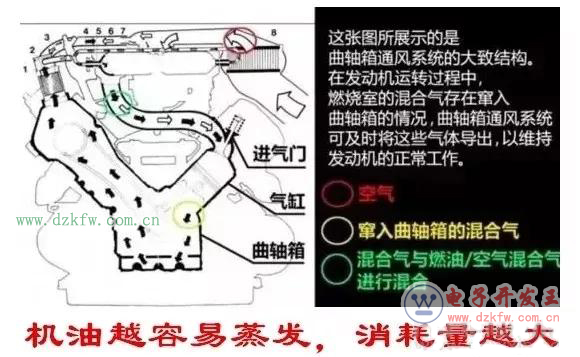 發動機還有一種消耗機油的途徑是曲軸箱通風。現在的汽車發動機出于減少環境污染和提高發動機經濟性的考慮,一般都采用曲軸箱強制通風技術,它可以把曲軸箱中的廢氣抽出并送入發動機的進氣管,吸入氣缸再燃燒。在這些廢氣中,不可避免的會含有一部分機油蒸汽,這樣也會消耗一部分的機油。
