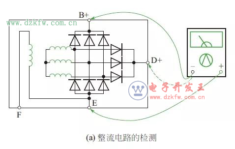 將數字式(萬用表)置于二極管擋或機械式萬用表電阻擋,如下圖所示,紅表筆接發電機“E”端,黑表筆接“B+”或“D+”,讀數應小于1V。如果讀數為0 或∞,說明整流器損壞;交換表筆,讀數應為∞,否則也表明整流器損壞。
