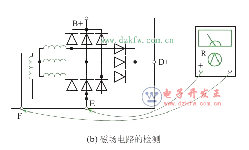 ② 也可以將“+”與“F”接線柱上的線頭都拆下,接上試燈后啟動發動機并慢慢提高轉速,觀察試燈。如果試燈隨發動機轉速升高亮度也增強,則為調節器有問題;如果試燈一直發紅或亮度無明顯變化,則為交流發電機內部有故障,例如個別二極管損壞,定子繞組某相松脫、短路等,應進一步解體檢查。