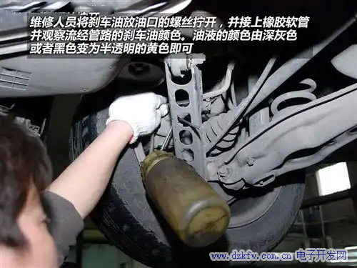 3)首先將 4輪剎車分泵放氣螺絲松開。在分泵放氣螺絲上套上一根透明塑料管,將管的另端放入一裝有制動液的容器內(nèi)。