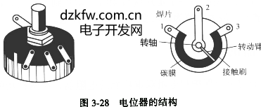 電位器作為阻值可調的電阻元件,在電路中可用作變阻器,或用作分壓器用,電位器的結構如圖3—28所示。