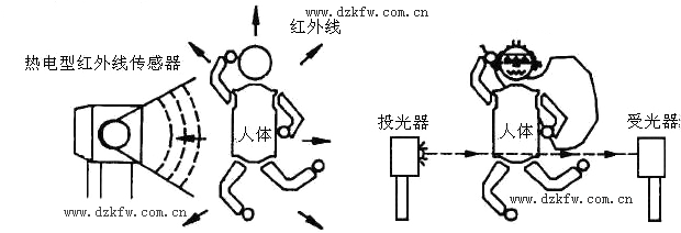 (2) 熱電型紅外線傳感器系接受檢知對象物所發出的紅外線,因此是被動型[請參照圖2(a)],由于不是圖(b)所示的主動型,所以并不需要校對投光器、受光器之光軸等煩瑣的作業。