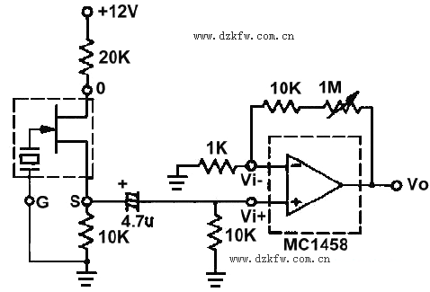 當人體接近感知器時,在源極(S)端感應一脈沖信號,送至運算放大器做一正向放大器。調整VR1MΩ,可改變輸出的放大倍數。