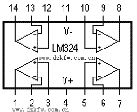 LM324為四運(yùn)放集成電路,采用14腳雙列直插塑料封裝。,內(nèi)部有四個(gè)運(yùn)算放大器,有相位補(bǔ)償電路。電路功耗很小,lm324工作電壓范圍寬,可用正電源3~30V,或正負(fù)雙電源±1.5V~±15V工作。它的輸入電壓可低到地電位,而輸出電壓范圍為O~Vcc。它的內(nèi)部包含四組形式完全相同的運(yùn)算放大器,除電源共用外,四組運(yùn)放相互單獨(dú)。每一組運(yùn)算放大器可用如圖所示的符號(hào)來表示,它有5個(gè)引出腳,其中“+”、“-”為兩個(gè)信號(hào)輸入端,“V+”、“V-”為正、負(fù)電源端,“Vo”為輸出端。兩個(gè)信號(hào)輸入端中,Vi-(-)為反相輸入端,表示運(yùn)放輸出端Vo的信號(hào)與該輸入端的相位相反;Vi+(+)為同相輸入端,表示運(yùn)放輸出端Vo的信號(hào)與該輸入端的相位相同。