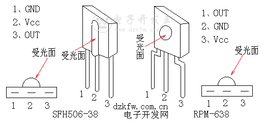 SFH506-38與RPM-638是一種特殊的紅外接收電路,它將紅外接收管與放大電路集成在一體,體積小(大小與一只中功率三極管相當),密封性好,靈敏度高,并且價格低廉,市場售價只有幾元錢。它僅有三條管腳,分別是電源正極、電源負極以及信號輸出端,其工作電壓在5V左右.只要給它接上電源即是一個完整的紅外接收放大器,使用十分方便。