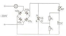 圖4所示是一個(gè)簡(jiǎn)單實(shí)用的調(diào)光臺(tái)燈電路。調(diào)節(jié)RP的阻值,可改變電容C充電達(dá)到UG值得時(shí)間,即調(diào)整晶閘管的導(dǎo)通角,使晶閘管早一點(diǎn)或遲一點(diǎn)觸發(fā)導(dǎo)通,從而調(diào)節(jié)晶閘管的輸出電壓,使燈兩端電壓能在0~220V間變化。電壓高,燈發(fā)光亮;電壓低,燈發(fā)光暗。