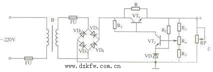 直流穩(wěn)壓電源電路如圖所示。一般R4可選小功率碳膜電位器、RP選大功率的線繞滑動(dòng)式電位器。調(diào)節(jié)R4的阻值可改變輸出電壓U的高低,調(diào)節(jié)RP可測(cè)試電源的帶負(fù)載能力。