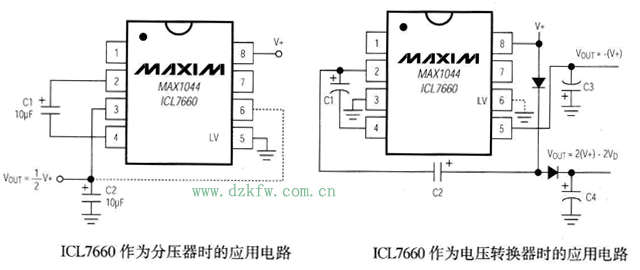 ICL7660有兩種工作模式:轉換器、分壓器。作為轉換器時,該器件可將1 .5一10 V范圍內的輸人電壓轉換為相應的負電壓;在分壓模式下工作時,它將輸入電壓一分為二。