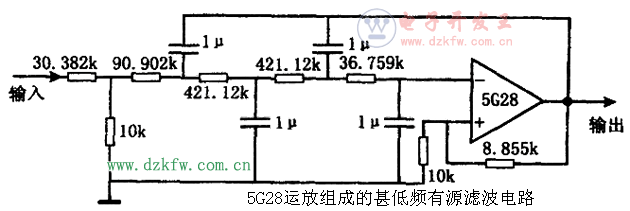這是一個巴特沃茲四階有源低通濾波器,適用于濾除直流電平信號上的甚低頻隨機脈沖噪聲干擾電壓,其截止頻率(-3dB)約為8Hz,在18Hz處,增益下降20dB。通帶內固有衰減為0.467。輸入電阻約為40kΩ。濾波器網絡電阻均采用數個金屬膜精密電阻串聯而成。如果其中1μF電容能達到相當精度,則截止頻率fc接近理論值。