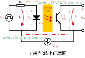 圖中的光耦內部結構由基本的三部分組成:發光二級管、透光絕緣層、光電三極管。通過發光二極管發光,穿透絕緣層到光電轉換三極管,實現電流的傳輸、隔離特性。
