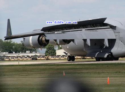后來的C-17環球霸王III,采用了YC-15這種外吹襟翼增升技術,起飛時,c17的襟翼向下彎折,發動機噴出高速氣流打在襟翼上,氣流改變了方向,向下走,這無疑會增加c-17的短距離起飛能力,它可以從1064米的短跑道上起飛。還可以從未經改善的跑道上起降。
